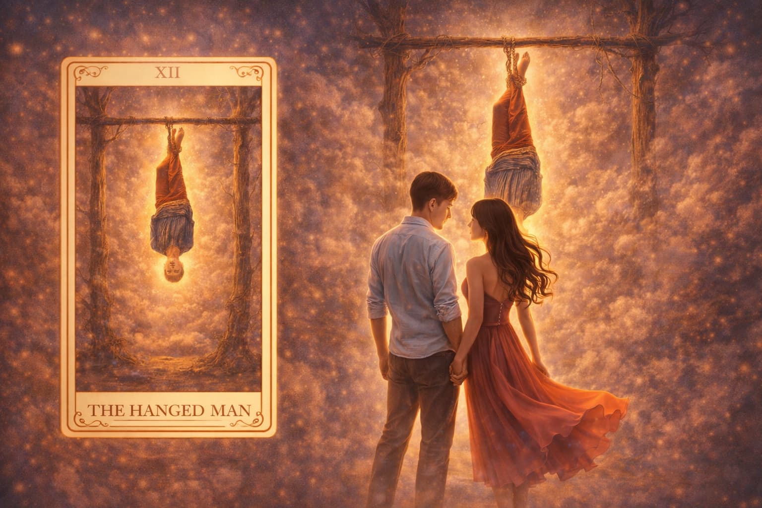 吊るされた男と恋人のカードが並ぶと、気持ちは確かにあるものの、その先に進むかどうかを迷っている段階として現れることがあります。