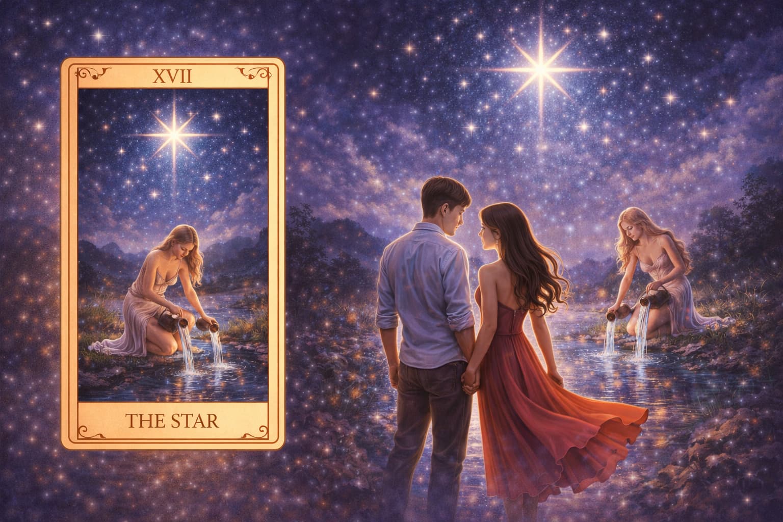 星と恋人のカードが並ぶと、関係が前向きに進み、希望が少しずつ形になっていく流れとして現れることがあります。